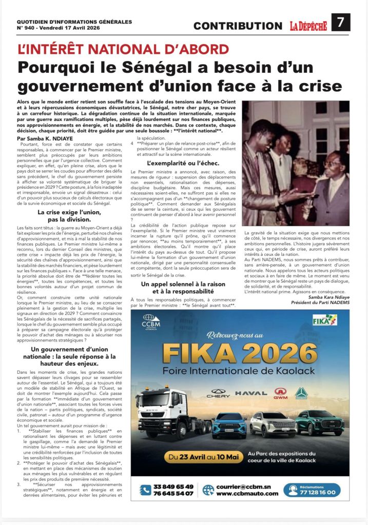 L’Intérêt National D’abord : Pourquoi le Sénégal a besoin d’un gouvernement d’union face à la crise.