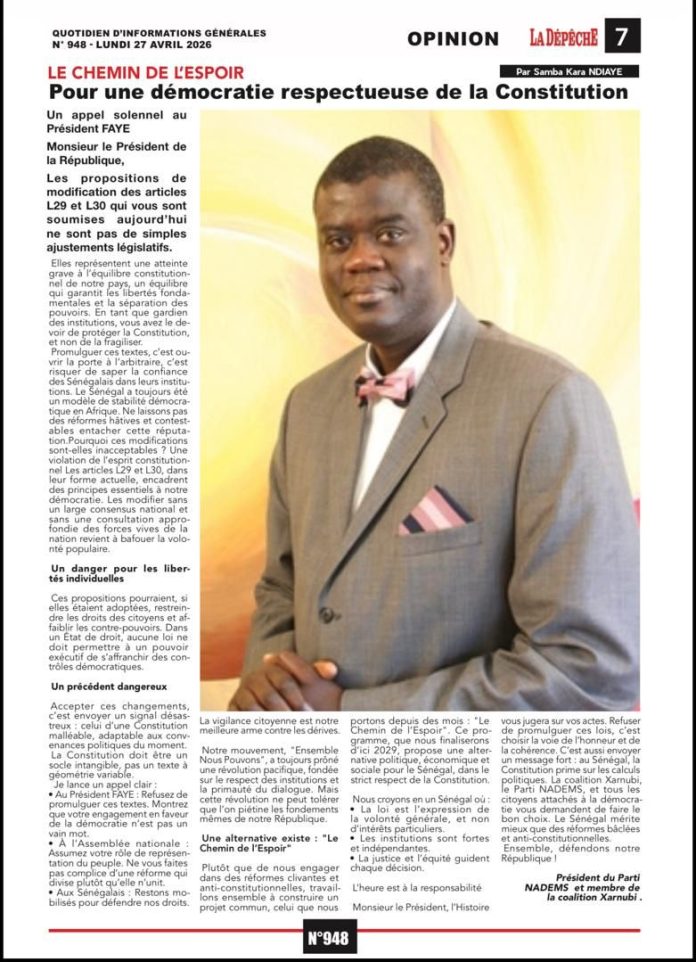 Le Chemin de l’Espoir : Pour une démocratie respectueuse de la ConstitutionPar Samba Kara Ndiaye, Président du Parti NADEMS membre de la coalition Xarnubi .
